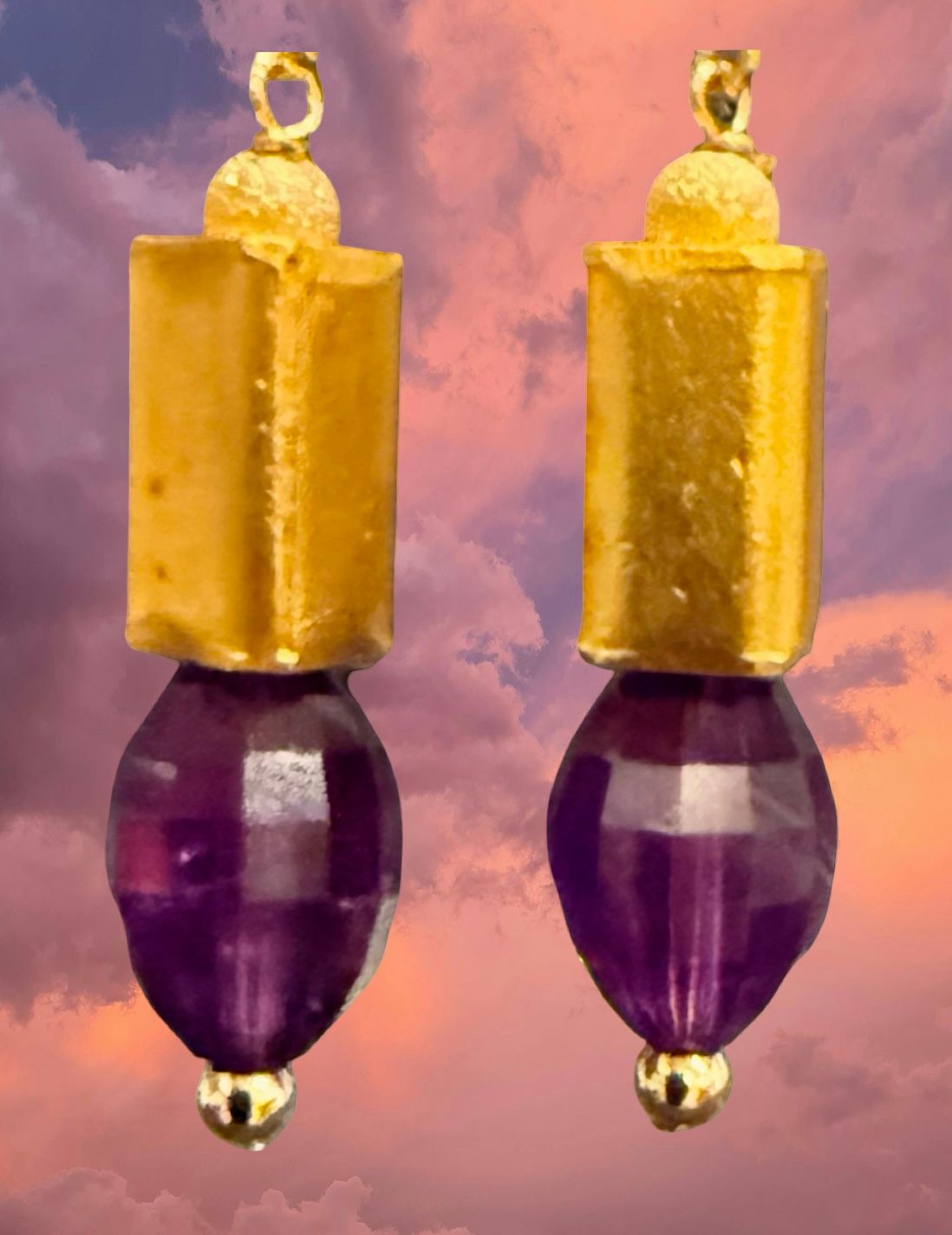 Faceted Brazilian Amethyst, brushed and pave 22k Gold Vermeil on 14k Gold filled lever back ear wires. Approx. 1 1/4" long
