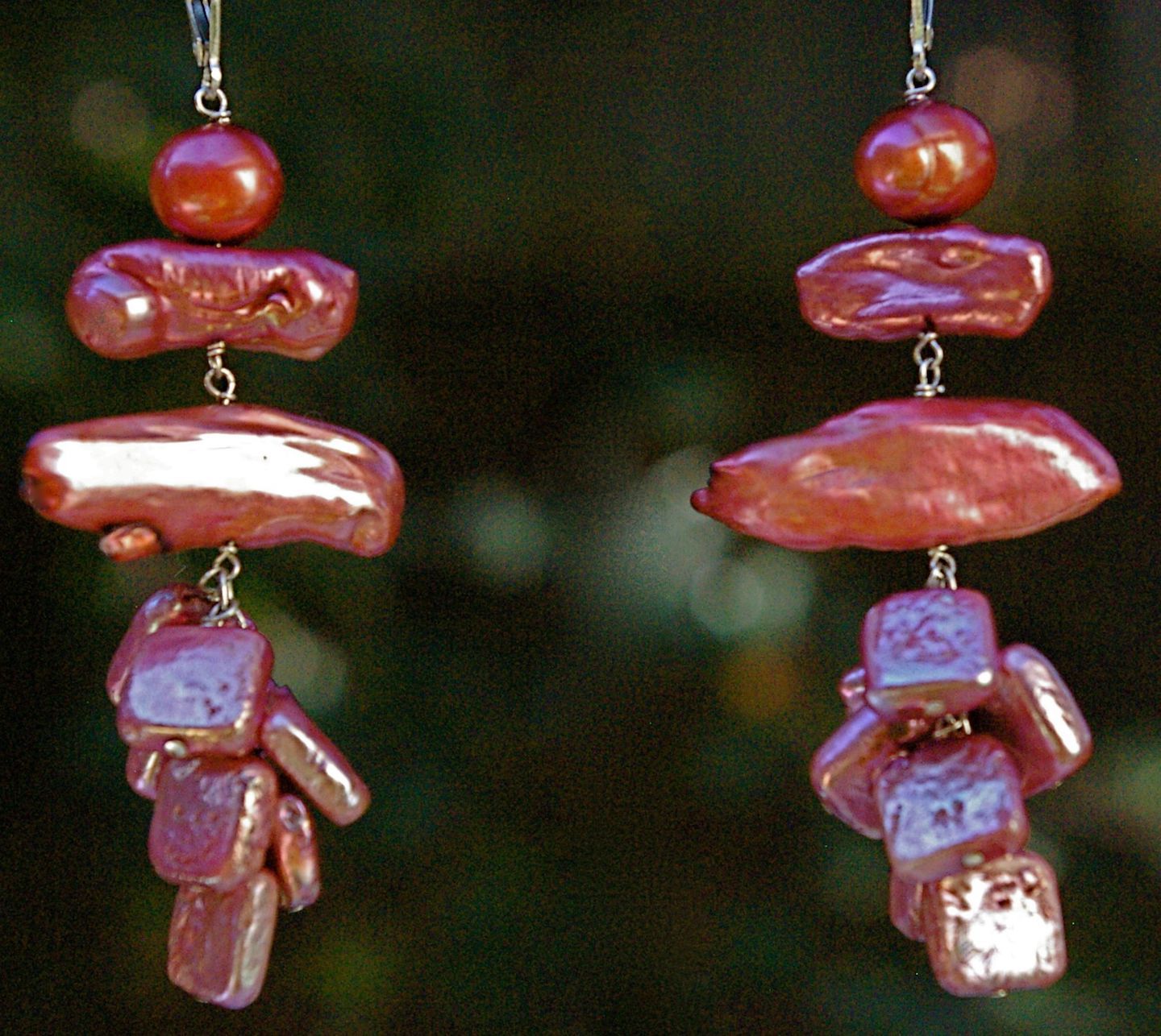Mauve square coin, giant biwa and fresh water pearls on Sterling Silver lever back ear wires.