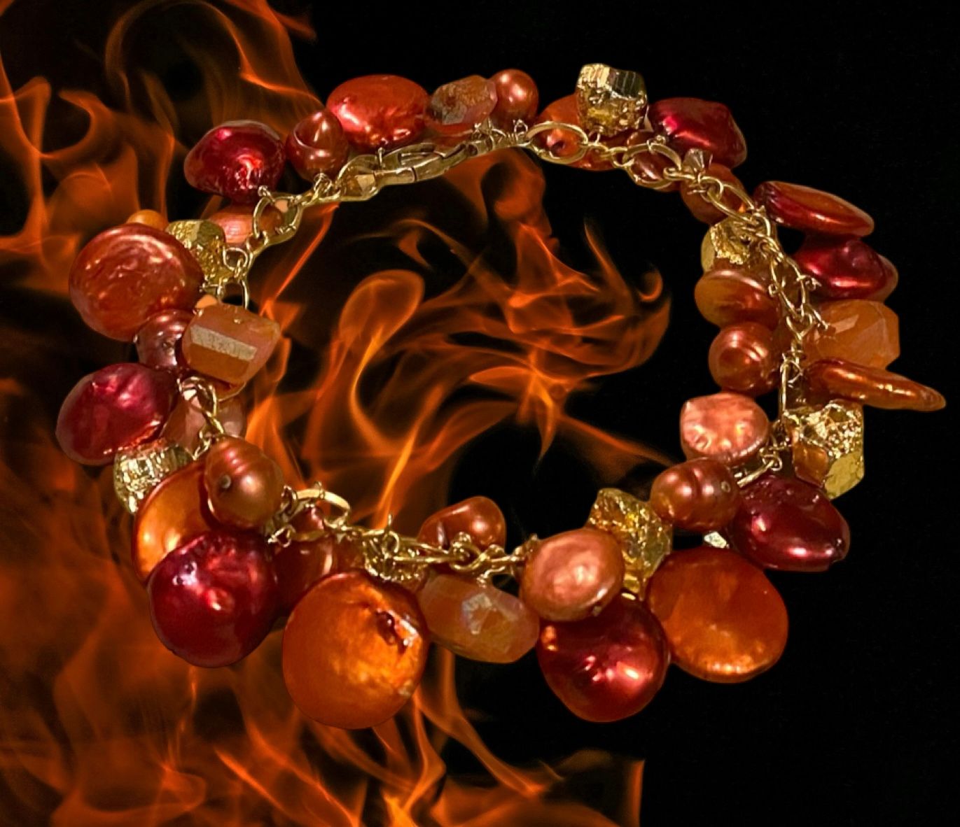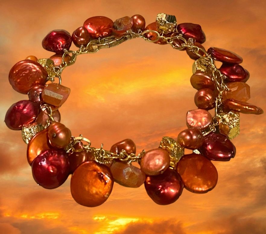 Coin, Fresh Water Pearls, Pyrite nuggets, Carnelian nuggets, Hessenite Garnet, Swarovski crystal on 14k Gold filed figure * chain with lobster clasp. Adjustable.